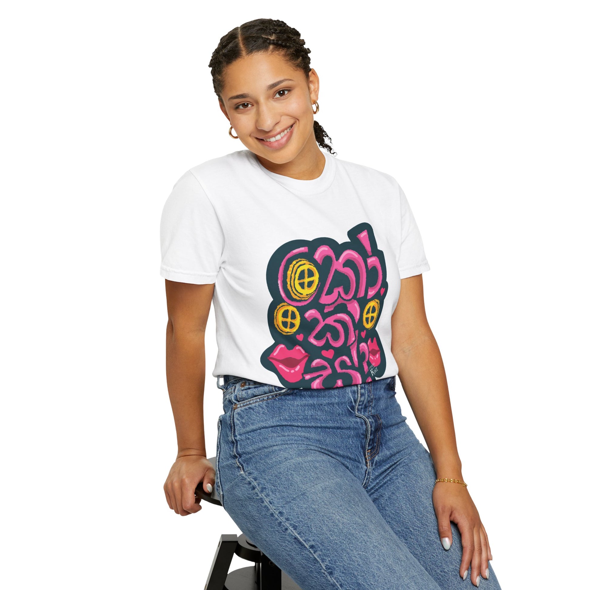 This t-shirt features a white background with words decorated in popping pink color, showcasing the word "Kokis." Kokis is a traditional Sri Lankan snack known for its intricate patterns and crispy texture, making it a beloved treat during festive occasions.