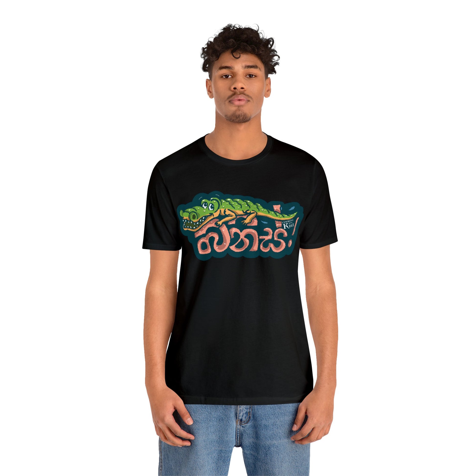 This t-shirt features a black background with words decorated in popping green color, showcasing the theme "Kimbula Banis." Kimbula Banis is a traditional Sri Lankan sweet bread roll, known for its unique shape and delicious taste.